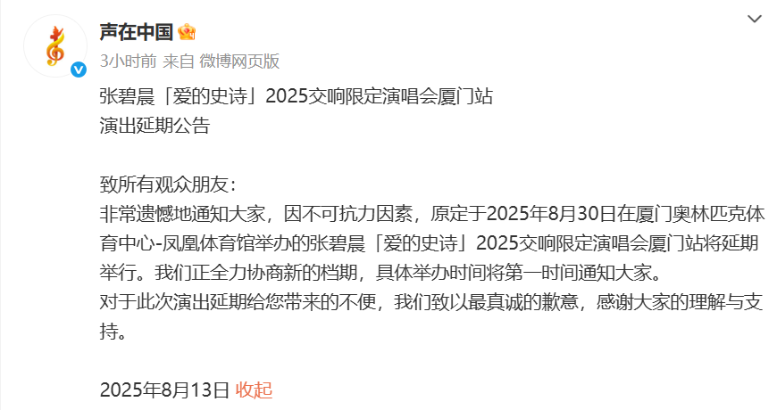 在8月13日,张碧晨的演唱会发布了一则令人意外的延期公告,原定于2025年8月30日举办的“爱的史诗”2025交响限定演唱会厦门站因不可抗力因素将推迟举行。这一消息引发了广泛关注,粉丝们纷纷在社交平台上留言表达遗憾,同时也期待着未来演唱会的举办。