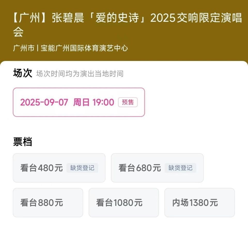 除了演唱会的延期,张碧晨的广州站演唱会也面临着一系列票务和市场问题。在7月28日,张碧晨的广州站演唱会开票时,部分票档(480元、680元)显示“缺货登记”,然而,内场和高价票的销售情况却显得不太理想,很多粉丝反映门票销量惨淡,且售票直播间遭到恶意刷屏干扰。